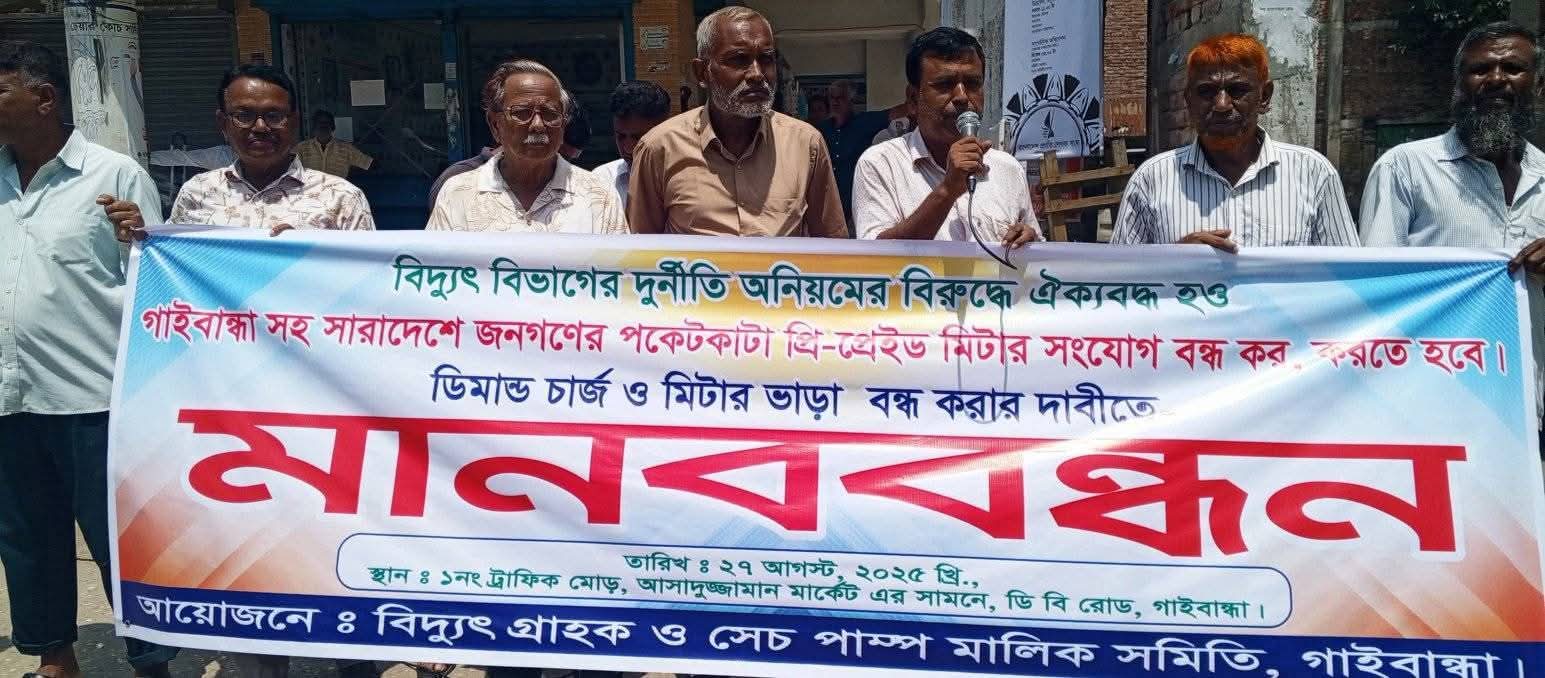 গাইবান্ধায় বিদ্যুৎ বিভাগের নানা অনিয়ম ও দুর্নীতি বন্ধের দাবিতে এবং অবৈধ প্রিপেইড মিটার সংযোগ বাতিলের দাবিতে এ মানববন্ধন অনুষ্ঠিত হয়েছে।আজ