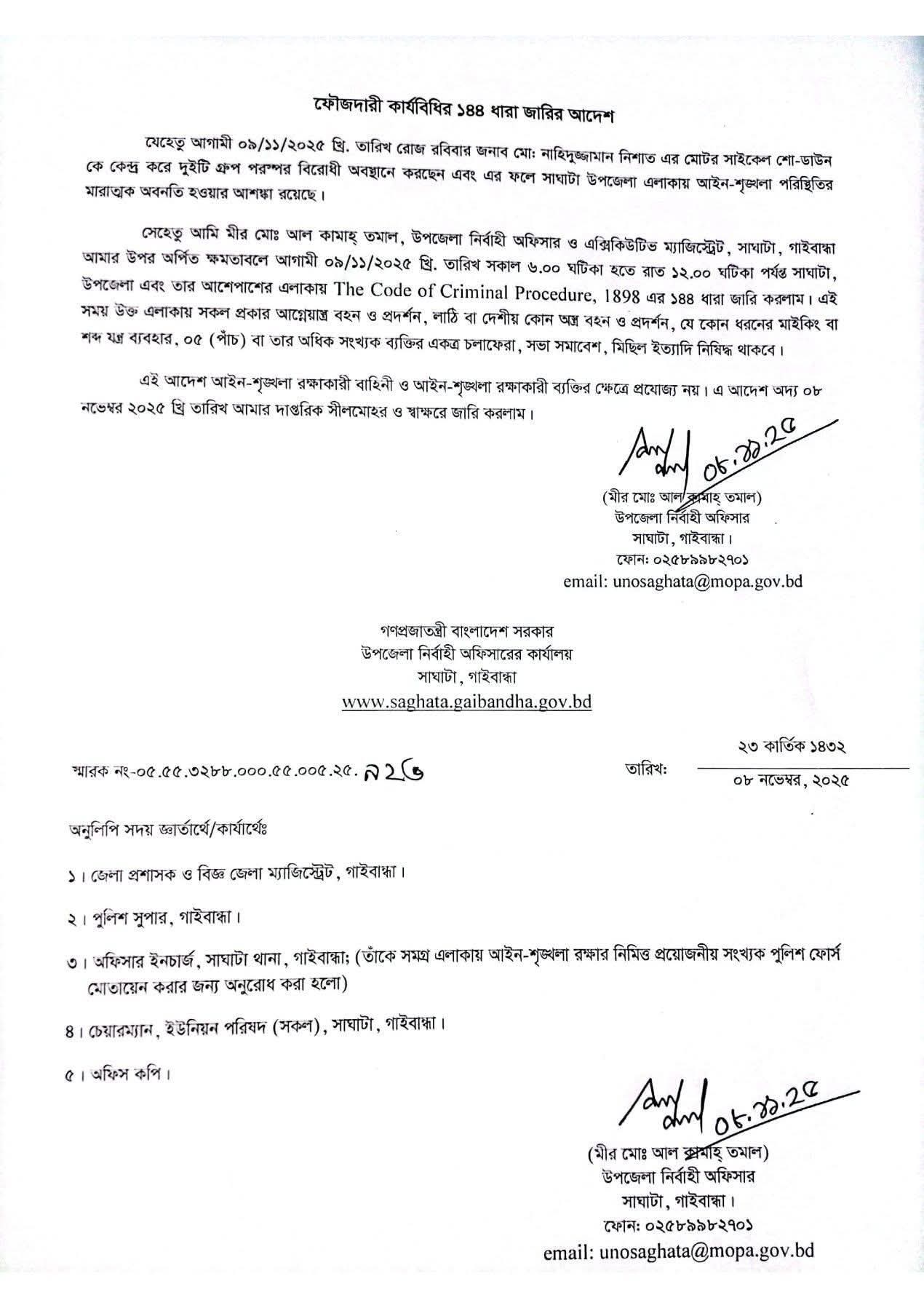 গাইবান্ধার সাঘাটা উপজেলায় সম্ভাব্য আইন-শৃঙ্খলা অবনতির আশঙ্কায় উপজেলা প্রশাসন ১৪৪ ধারা জারি করেছে। উপজেলা নির্বাহী অফিসার ও নির্বাহী ম্যাজিস্ট্রেট মীর