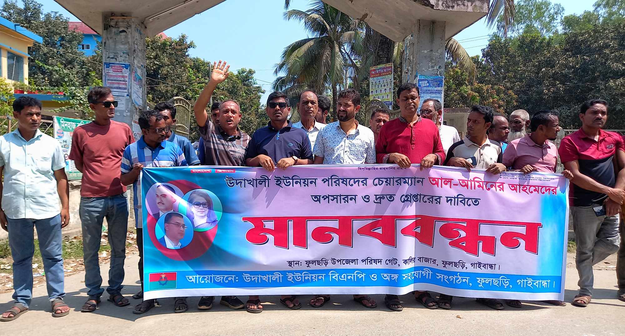 গাইবান্ধার ফুলছড়ি উপজেলার উদাখালী ইউনিয়ন পরিষদের চেয়ারম্যান আল-আমিন আহমেদের অপসারণ ও গ্রেপ্তারের দাবীতে মানববন্ধন করেছে বিএনপির নেতাকর্মীরা। মঙ্গলবার (২৫ মার্চ)