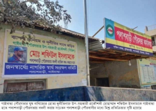 দূর্নীতির বরপুত্র, ঘুষ বাণিজ্যের হোতা উপ-সহকারী প্রকৌশলী মোহাম্মাদ শফিউল ইসলামকে সম্প্রতি গাইবান্ধা পৌরসভা হতে পলাশবাড়ী পৌরসভায় বদলি করায় ফুসে উঠেছে