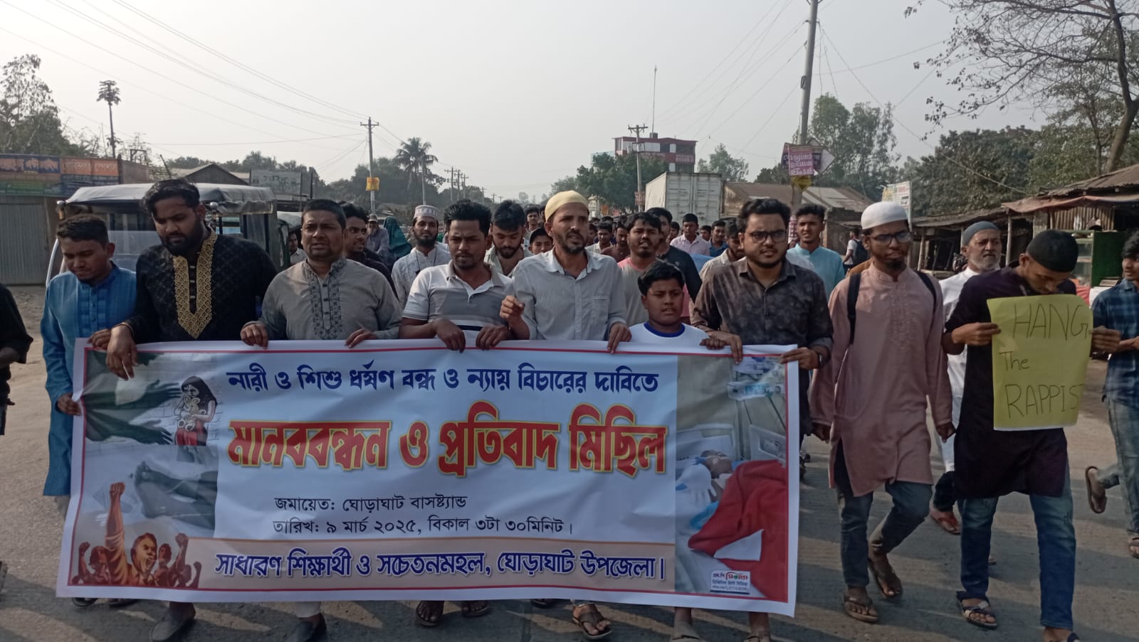দেশের বিভিন্ন স্থানে নারী-শিশুসহ সবার ন্যায় বিচার ও ধর্ষণ বন্ধের দাবিতে দিনাজপুরের ঘোড়াঘাটে বিভিন্ন শিক্ষাপ্রতিষ্ঠানের শিক্ষার্থীরা মানববন্ধন ও প্রতিবাদ মিছিল