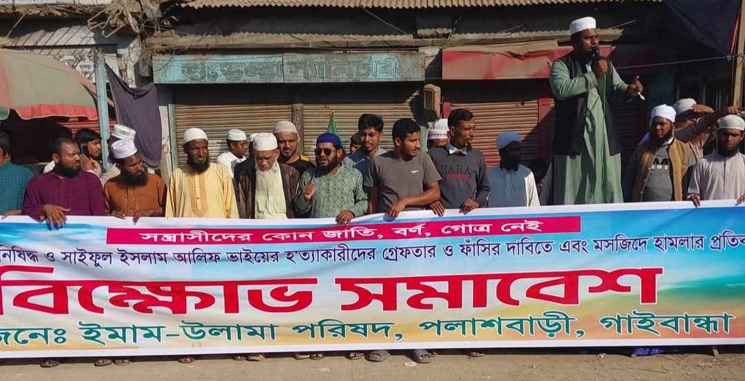 গাইবান্ধা জেলার পলাশবাড়ীতে ইমাম ওলামা পরিষদের আয়োজনে ২৯ নভেম্বর শুক্রবার জুমার নামাজের পরবর্তী স্হানীয় চৌমাথা মোর মিতালী হোটেলের সম্মুখে সনাতন