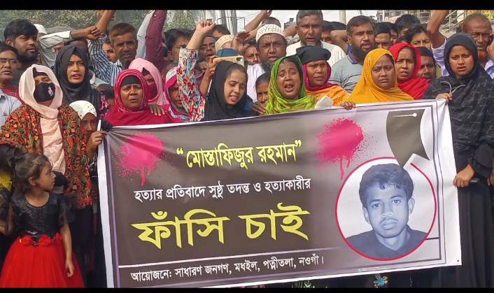 মোস্তাফিজুর হত্যার প্রতিবাদে পত্নীতলায় মানববন্ধন