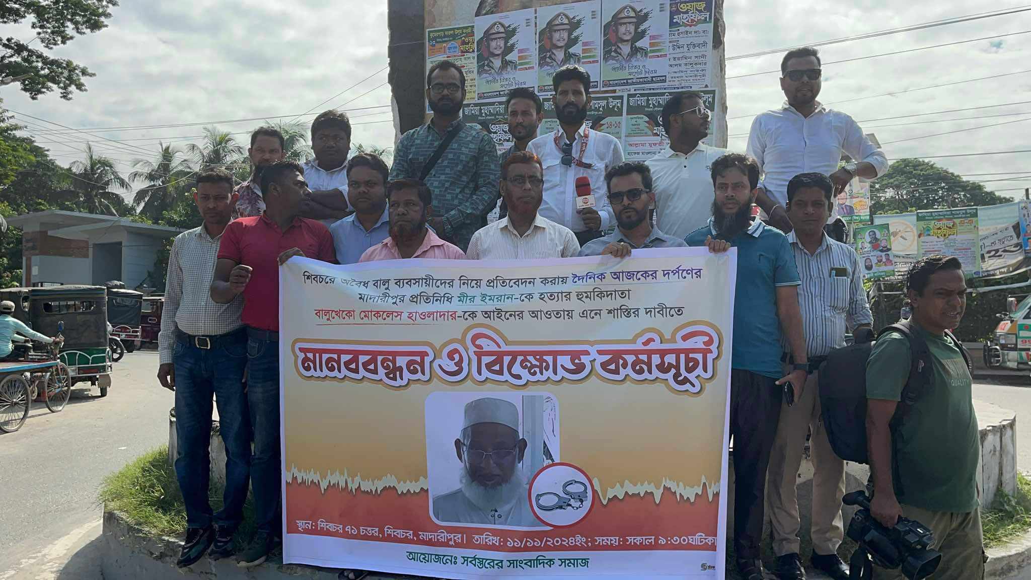 মাদারীপুরে বালু চুরির নিউজ করায় সাংবাদিককে হত্যার হুমকির প্রতিবাদে মানববন্ধন ও বিক্ষোভ কর্মসূচি গনমাধ্যম কর্মীদের