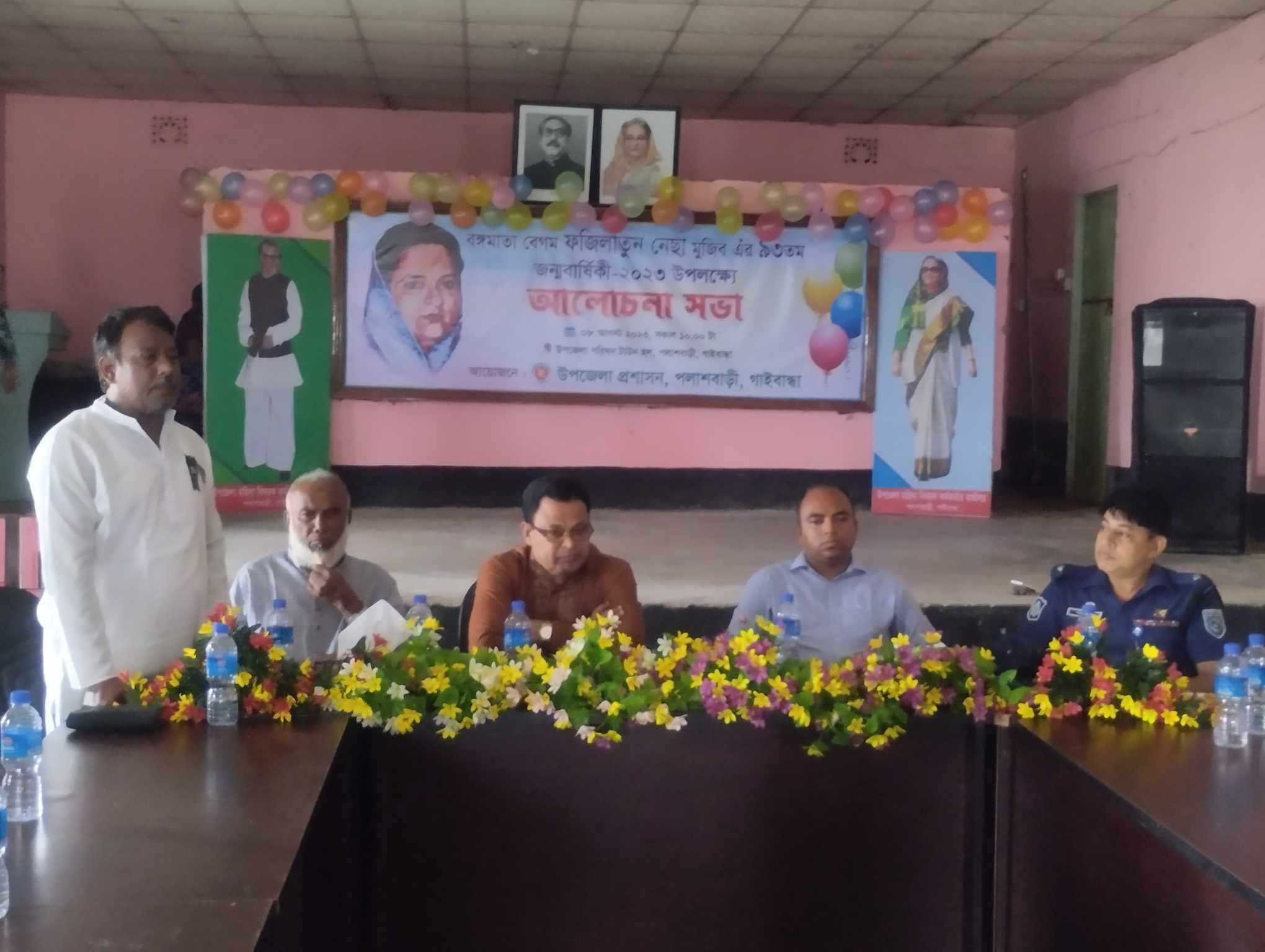 গাইবান্ধার পলাশবাড়ী উপজেলা প্রশাসনের আয়োজনে বঙ্গমাতা শেখ ফজিলাতুন্নেছা মুজিব এর ৯৩ তম জন্ম বার্ষিকী উপলক্ষে আলোচনা সভা অনুষ্ঠিত হয়েছে। ৮