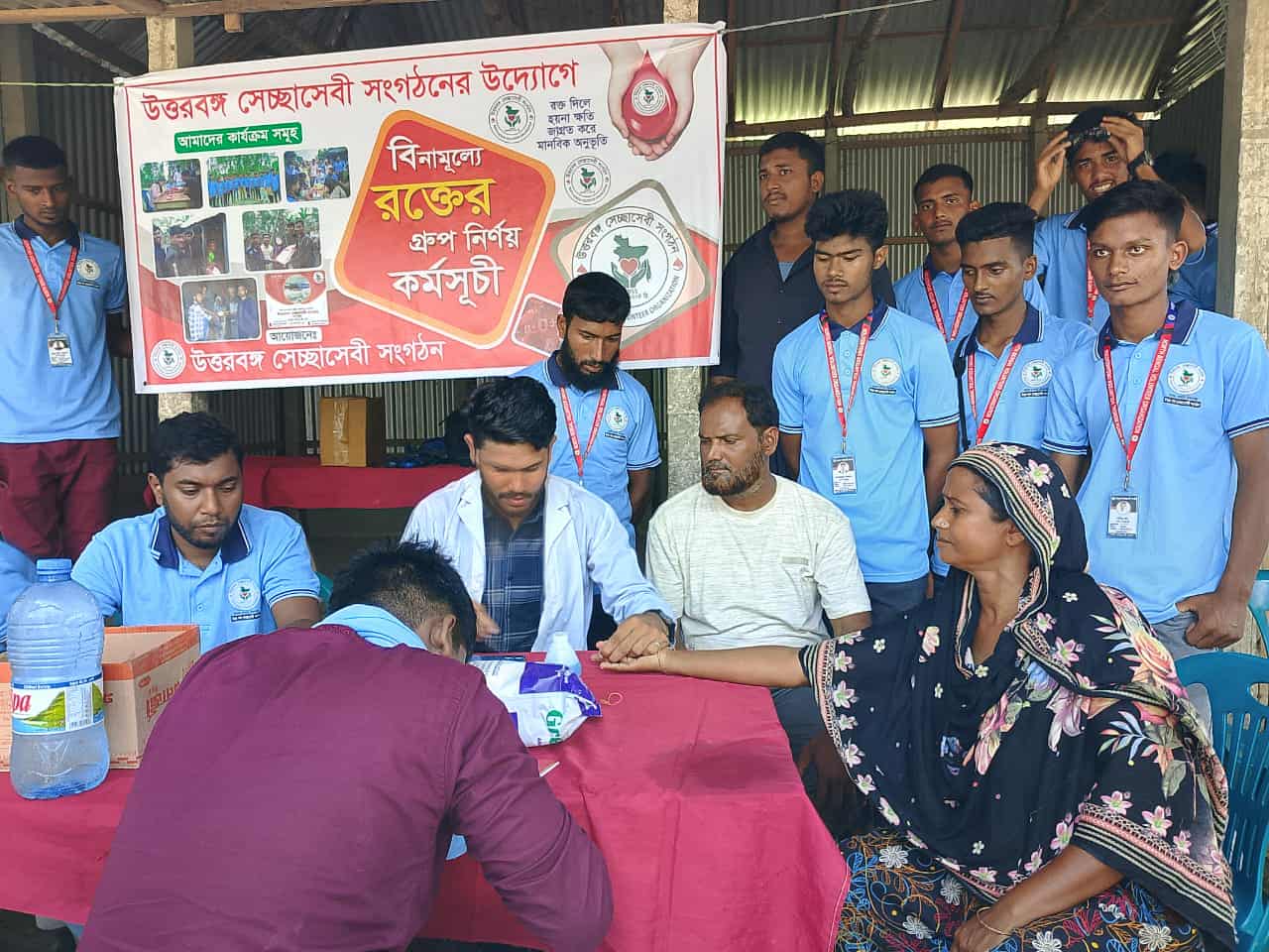 গাইবান্ধার ফুলছড়ি উপজেলার চরাঞ্চলীয় এরেন্ডাবাড়ী ইউনিয়নের আলগার চর বাজারে উত্তরবঙ্গ স্বেচ্ছাসেবী সংগঠনের উদ্যোগে বিনামূল্যে রক্তের গ্রুপ নির্ণয় ও ফ্রি ব্লাড