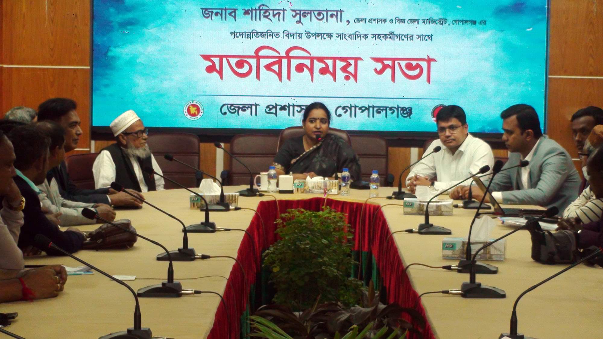 গোপালগঞ্জের জেলা প্রশাসক শাহিদা সুলতানার পদোন্নতিজনিত বিদায় উপলক্ষে সাংবাদিকদের সাথে মতবিনিময় সভা অনুষ্ঠিত হয়েছে। জেলা প্রশাসন এ সভার আয়োজন করে।