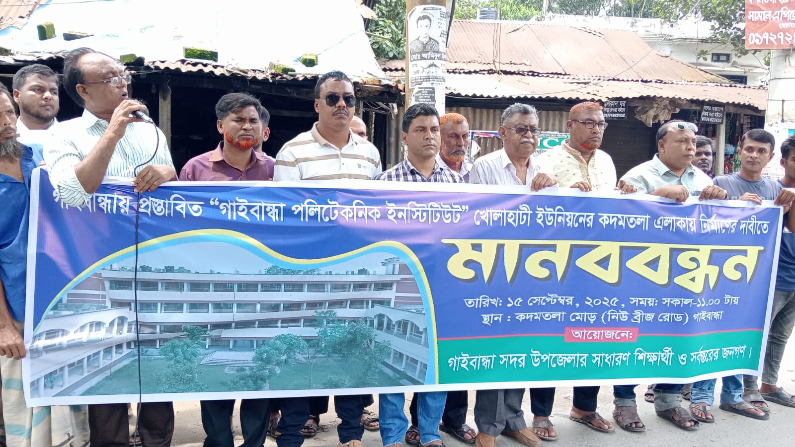 গাইবান্ধায় প্রস্তাবিত “গাইবান্ধা পলিটেকনিক ইনস্টিটিউট” পূর্ব নির্ধারিত খোলাহাটী ইউনিয়নের টিটিসি সংলগ্ন এলাকায় স্থাপনের দাবীতে মানববন্ধন অনুষ্ঠিত হয়েছে। আজ সোমবার (১৫