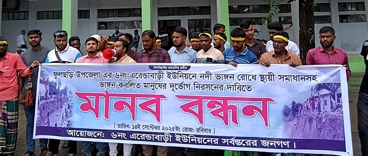 গাইবান্ধার ফুলছড়ি উপজেলার এরেন্ডাবাড়ী ইউনিয়নের নদী ভাঙন রোধ ও ভাঙনকবলিত মানুষের দুর্ভোগ নিরসনের দাবিতে মানববন্ধন অনুষ্ঠিত হয়েছে। রবিবার (১৪ সেপ্টেম্বর)