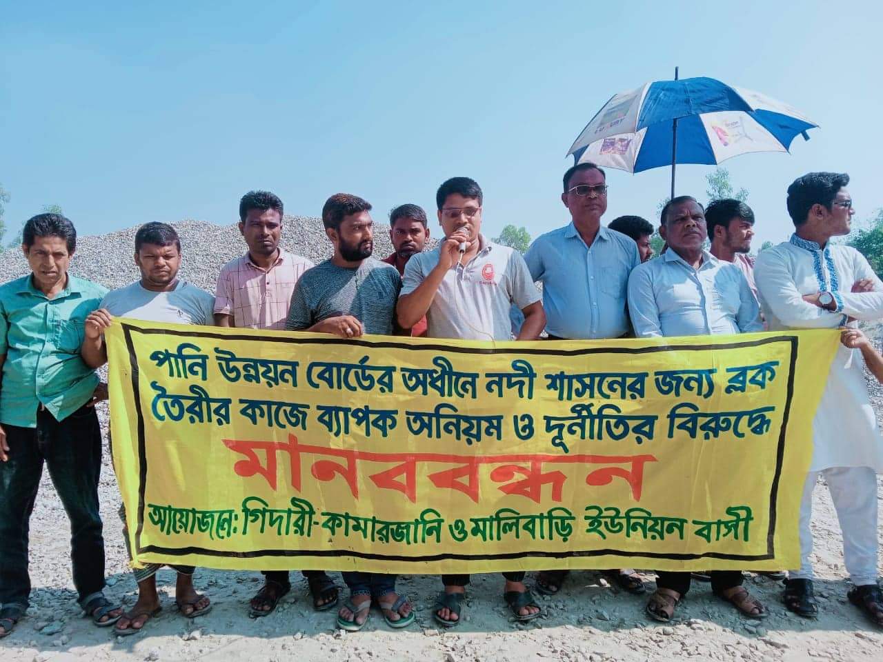 গাইবান্ধা পানি উন্নয়ন বোর্ডের অধীনে নদী শাসনের জন্য সিসি ব্লক তৈরির কাজের অনিয়ম ও দূর্ণীতির বিরুদ্ধে মানববন্ধন অনুষ্ঠিত হয়েছে।