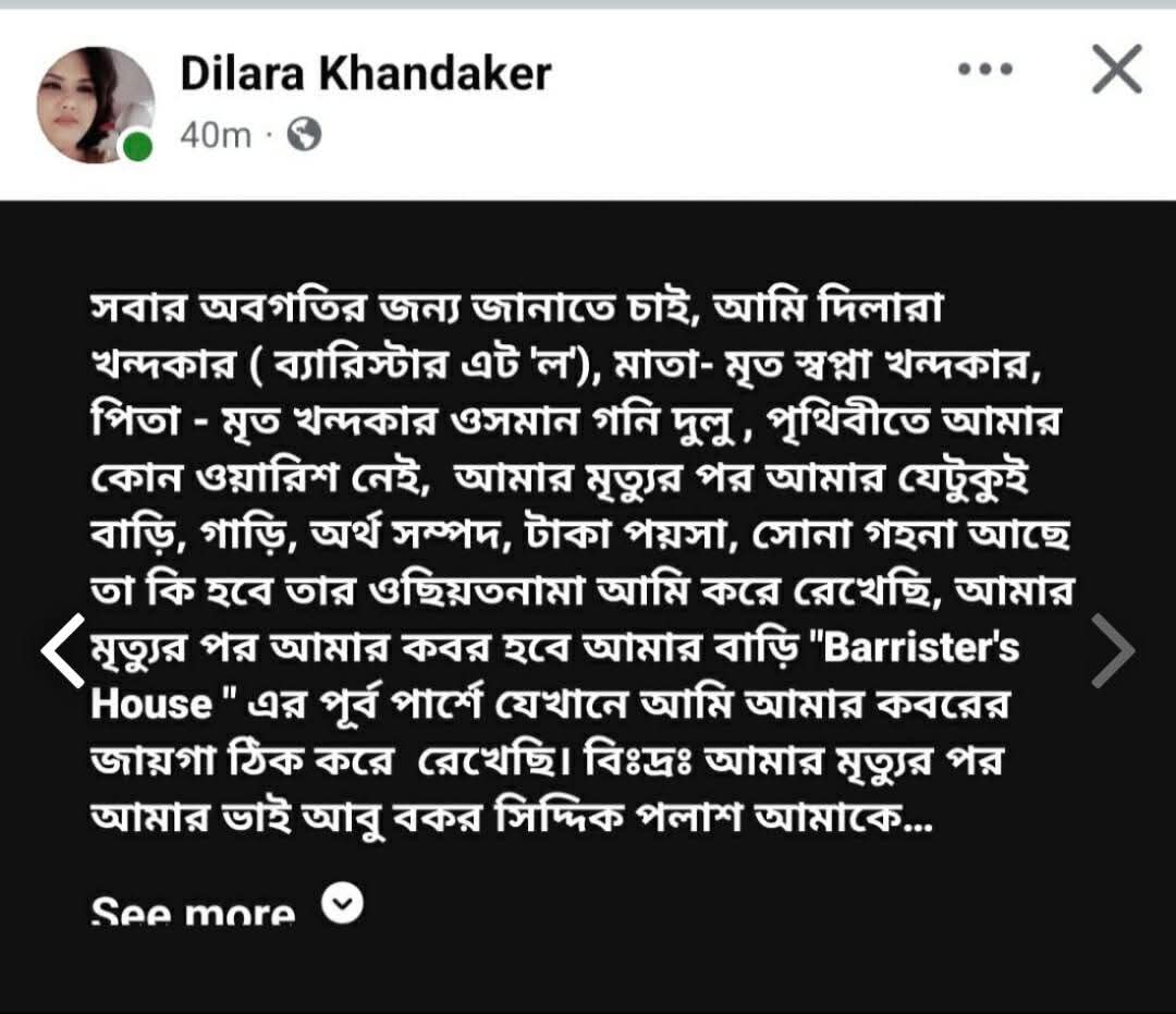 “পৃথিবীতে আমার কোনও ওয়ারিশ নেই’ — ব্যারিস্টার দিলারা খন্দকারের ফেসবুক স্ট্যাটাস থেকে