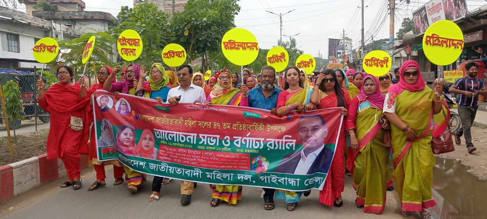 বাংলাদেশ জাতীয়তাবাদী মহিলা দলের ৪৭তম প্রতিষ্ঠাবার্ষিকী উপলক্ষে গাইবান্ধায় আলোচনা সভা ও বর্ণাঢ্য র্যালির আয়োজন করা হয়েছে। মঙ্গলবার দুপুরে জেলা
