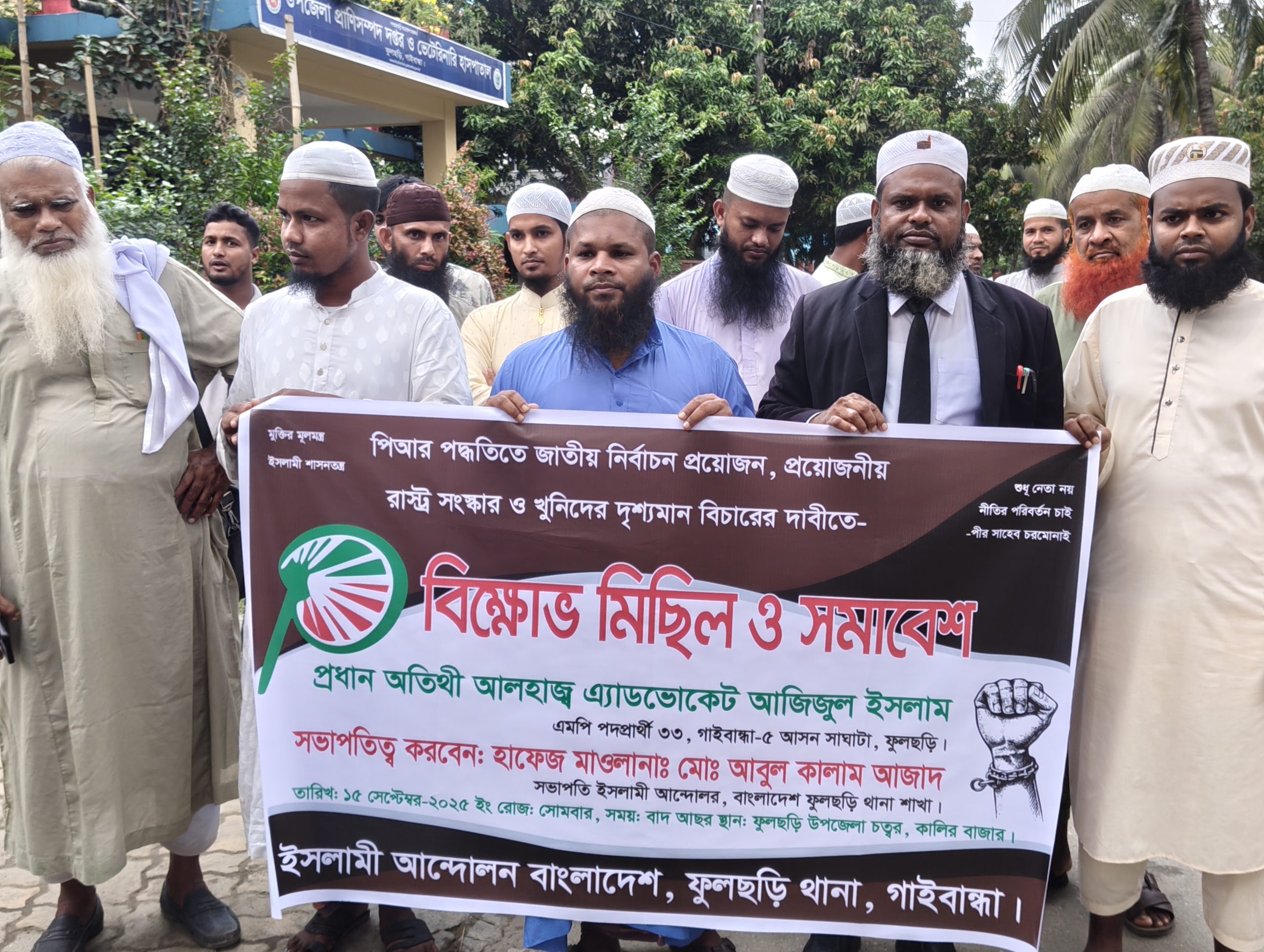 গাইবান্ধার ফুলছড়ি উপজেলায় ইসলামী আন্দোলন বাংলাদেশের উদ্যোগে বিক্ষোভ মিছিল ও সমাবেশ অনুষ্ঠিত হয়েছে। জাতীয় নির্বাচনে পিআর (আনুপাতিক প্রতিনিধিত্ব) পদ্ধতি প্রবর্তনের