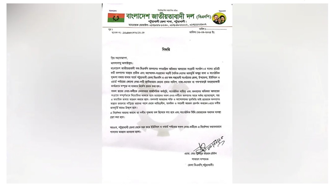 পটুয়াখালীতে সালিশ, দাঙ্গাফ্যাসাদ বা পক্ষপাতদুষ্ট মধ্যস্থতাকারী কার্যক্রমে সম্পৃক্ত না হতে বিএনপি নেতাকর্মীদের নির্দেশ দেওয়া হয়েছে। মঙ্গলবার (১৬ সেপ্টেম্বর) রাতে জেলা
