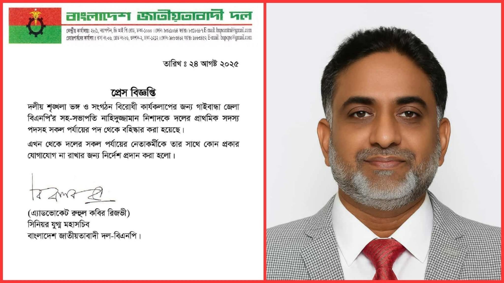 গাইবান্ধা জেলা বিএনপির সহ-সভাপতি নিশাদকে বহিষ্কার