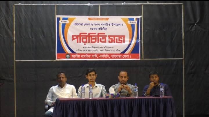 গাইবান্ধা জাতীয় নাগরিক পাটির পরিচিতি সভা অনুষ্ঠিত হয়েছে। রবিবার বিকেল গাইবান্ধা জেলা শিল্পকলা একাডেমির হলরুমে এই পরিচিতি সভা অনুষ্ঠিত হয়।