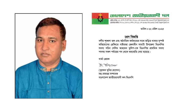দলীয় শৃঙ্খলা ভঙ্গ এবং অনৈতিক কর্মকাণ্ডে জড়িত থাকার সুস্পষ্ট অভিযোগের প্রেক্ষিতে গাইবান্ধা জেলার সাঘাটা উপজেলা বিএনপির সদস্য সচিব সেলিম আহমেদ