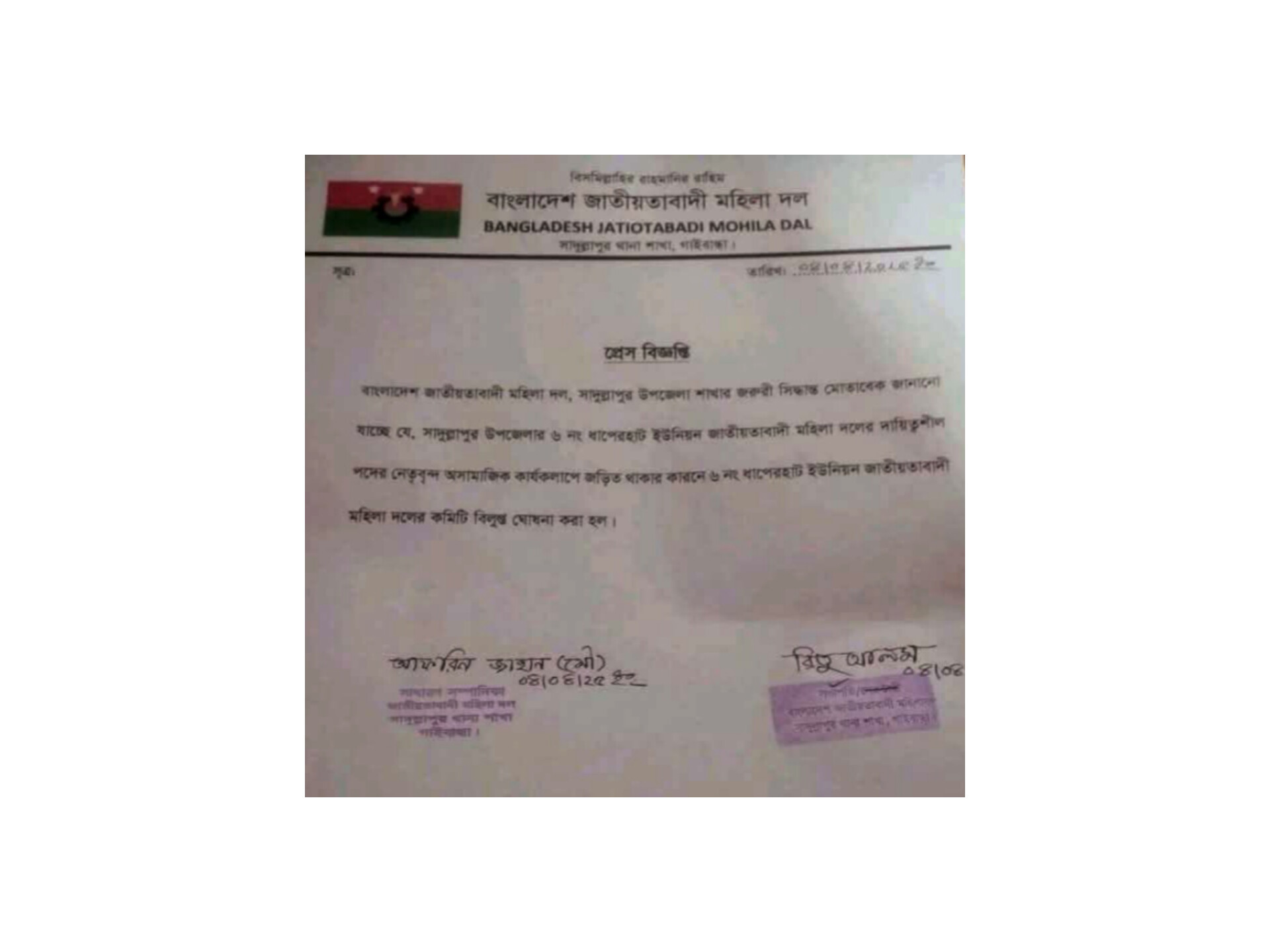 ধাপেরহাট ইউনিয়ন মহিলা দলের কমিটি বিলুপ্ত