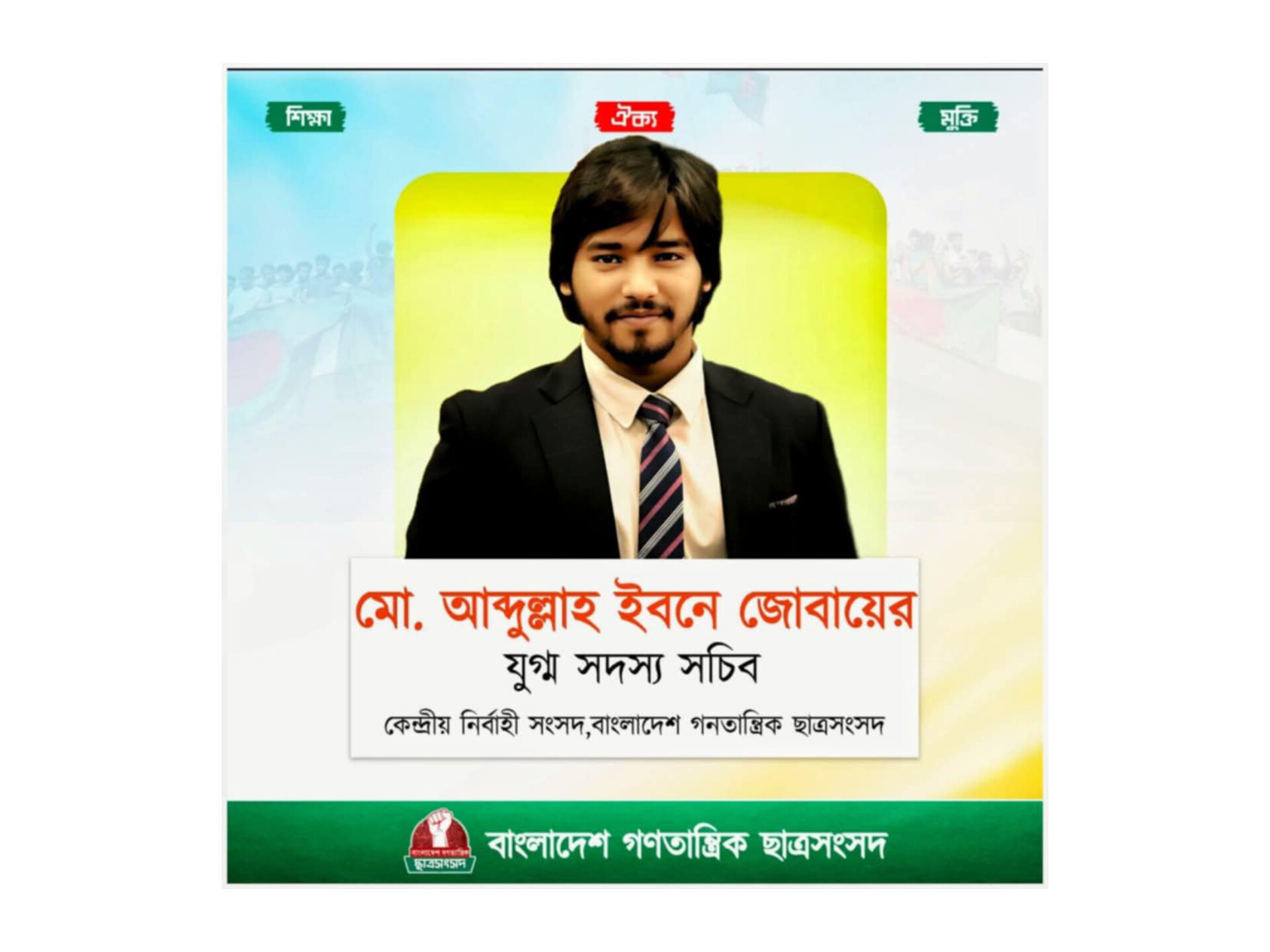 বাংলাদেশ গনতান্ত্রিক ছাত্রসংসদ এর যুগ্নসদস্য সচিব হলেন পলাশবাড়ীর আব্দুল্লাহইবনে জোবায়ের।