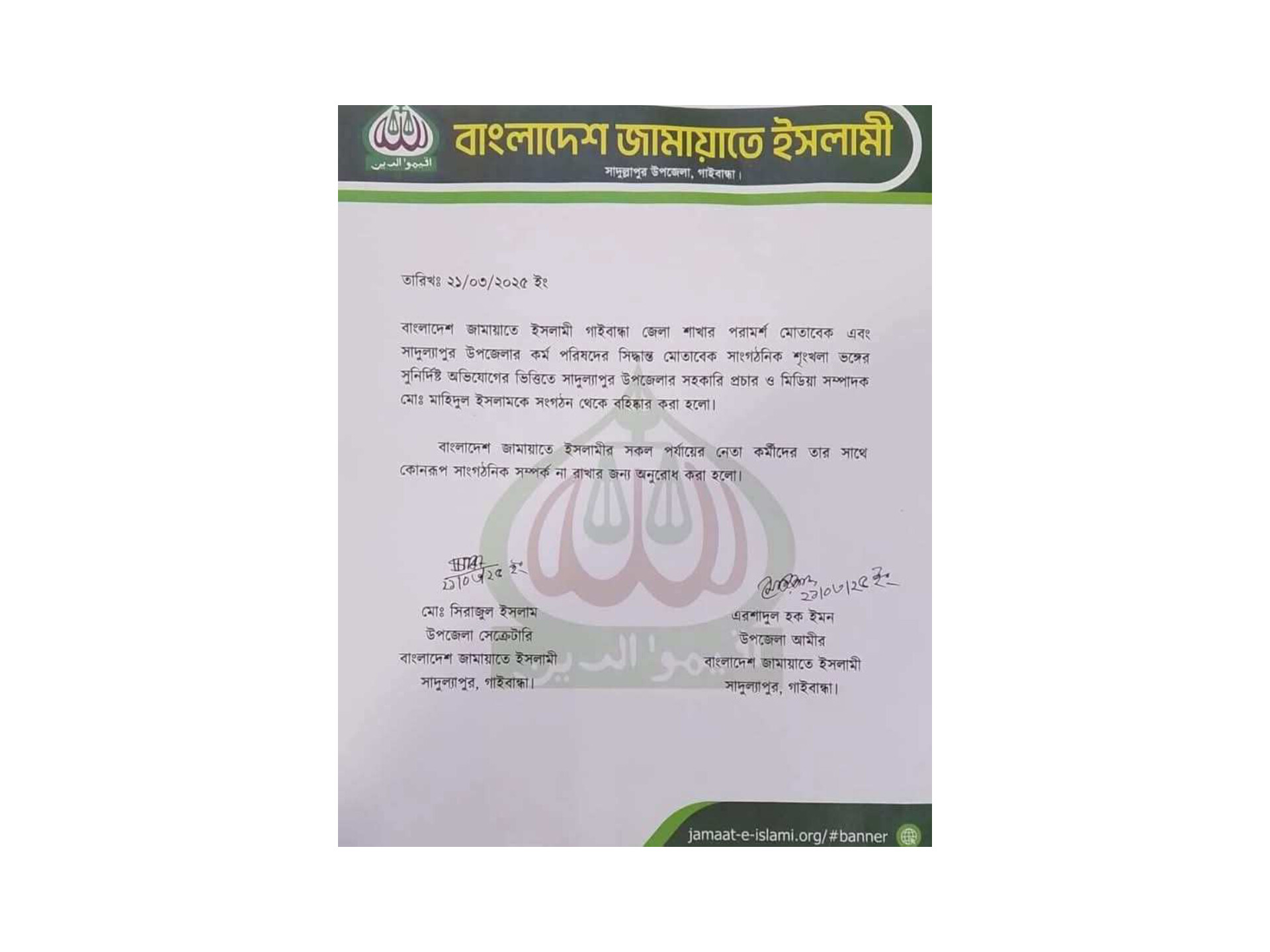 সাংগঠনিক শৃঙ্খলা ভঙ্গের অভিযোগে সাদুল্লাপুরে জামায়াত নেতাকে বহিষ্কার